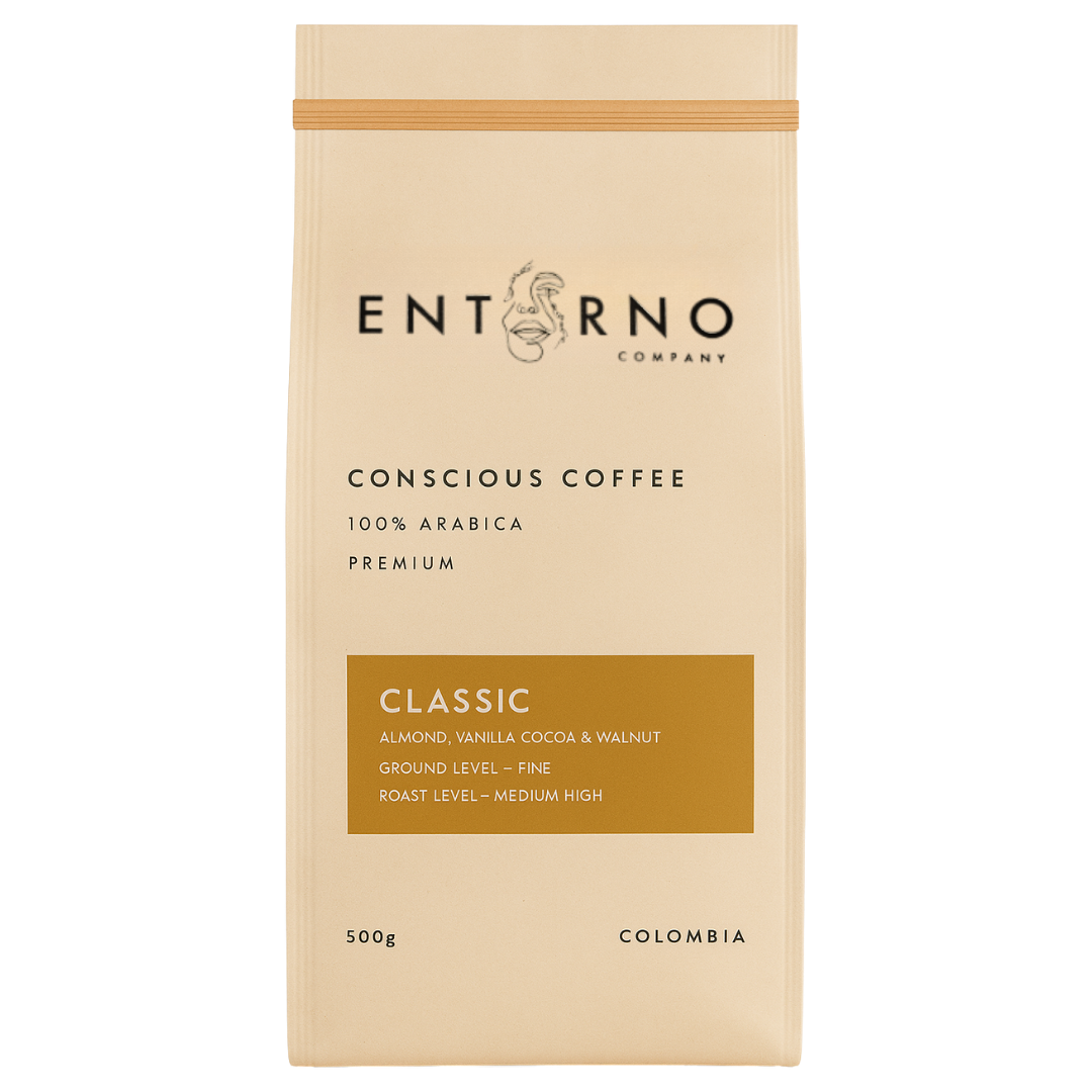 Classic Line is a refined single origin coffee from Neiva, Huila (1,600 m), blending Castillo and Tabi varieties processed using the washed method. Expect a sweet cane fragrance immediately, followed by delicate notes of almond, vanilla, cocoa, and walnut.